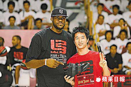 【本報訊】NBA球星「大帝」勒邦占士昨天下午出訪灣仔修頓室內場,展開訪港公開活動頭炮;勒邦占士在全場觀眾吶喊下,表演了在港「唯一」一次入樽,並送出了簽名球鞋予入樽賽冠軍羅意庭。