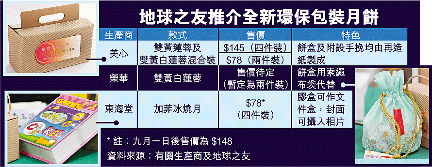 地球之友上月中訪問了三百多名市民,當中七成三受訪者稱從沒聽過有環保包裝的月餅;調查又發現逾六成市民願意選購環保包裝的月餅。該會從去年底起與四間月餅商合作設計環保月餅盒,最後從六個款式挑選三個向市民推介。