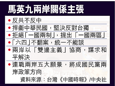 將於本月十九日上任國民黨主席的台北市長馬英九首度就兩岸政策作出全面闡釋,重申反共不反中、反對「一國兩制」、反對台獨的立場。他強調,民主政治有利兩岸關係,上任後對要求平反「六四」、聲援法輪功以及批判《反分裂國家法》的立場,仍然不變,而兩岸統一談判的先決條件,就是「六四不翻案,統一不能談」。