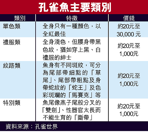 孔雀世界負責人黃子恒說,該公司成立一年,引進日本、德國孔雀魚,並培植本地品種,為魚迷提供內地以外的選擇,「內地孔雀魚質素參差,有啲好易死。」本地及海外孔雀魚約售二十多元至千多元不等,全紅色的可高達兩、三萬元。