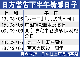 日本駐上海總領事館的通知指出,現時中國的反日示威雖然沉寂下來,但今年是「抗戰勝利六十周年」的敏感時刻,下半年會有各種各樣跟戰爭有關的紀念日(見表),僑民今後有必要密切留意中國國內外的形勢。