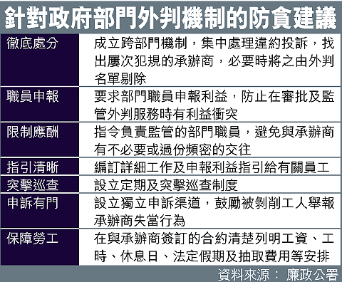 廉署接受查詢時表示,署方支持成立跨部門機制,以便有效地找出重複違規的承辦商,必要時更應將之剔除於部門的外判名單之中。該署又提出七項針對各部門外判問題的防貪建議(見表),包括外判商必須清楚訂定員工的工資等資料,防止有人從中舞弊。
