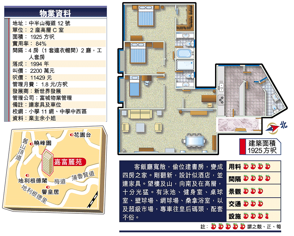 嘉富麗苑1座望維港,2座望山景,總數240伙,以自住為主,放盤約10個,視乎景觀,放盤呎價8000至1萬元,造價相若。這個單位望山,但在高層,全新裝修及連家具,因此開價高。