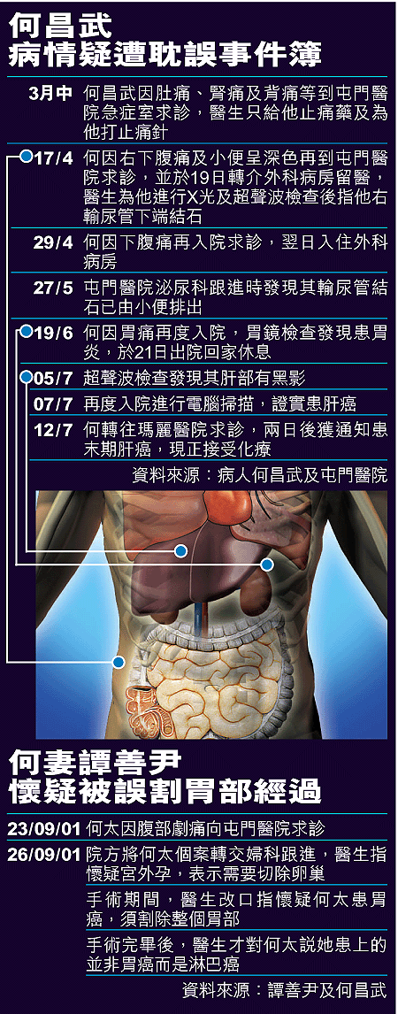 屯門醫院回覆本報查詢時證實,何昌武於本年四月十七日及十九日因右下腹痛及小便呈深色到急症室求診,留院期間發現右輸尿管下端結石;在四月二十九日及三十日病人再求診,泌尿科於五月二十七日跟進時發現其輸尿管結石已由小便排出。到六月十九日何因胃痛再求診,因病人表示有持續上腹痛,故安排七月五日進行超聲波檢查,證實患末期肝癌。