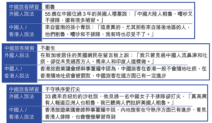 《星期日海峽時報》收到的電郵,有一半都認為中國旅客的確很「醜陋」,一名在中國居住了三年的英國人,指中國人「粗暴、嘈吵和不守秩序」;一名中國讀者,也認同一些中國遊客非常失禮。