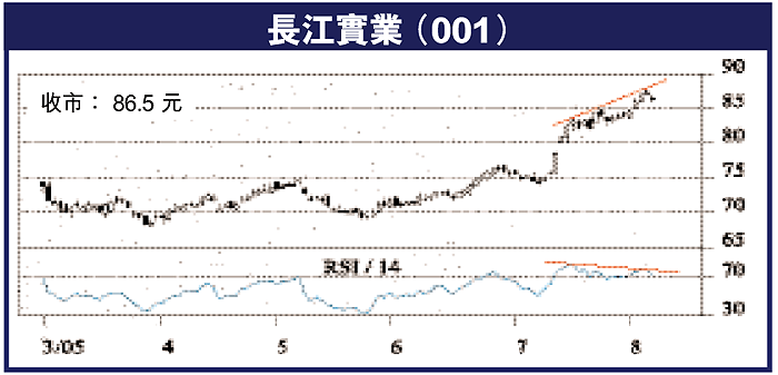 在這一升浪中,以地產股之升勢較強,銀行股是升勢較弱的一環。在3大地產股中,若以7月8日為起點計算,以長實(001)的升勢最強,其次為恒地(012),新鴻基地產(016)的升勢相對較弱。此外,這3大地產股的14天RSI,近期的升勢漸漸追不上股價之升勢,開始出現與股價背馳之形態。附圖是長實與14天RSI的日線圖,圖中可見,近日長實的股價雖持續反覆上升,惟其RSI已明顯跟不上,與股價之升勢背馳,但投資者不要誤會,這並非即時沽貨訊號,因為在大升浪中,往往會出現3頂背馳,甚至4頂背馳才正式回落,故不宜過早獲利回吐,現在只是戒備訊號而已。