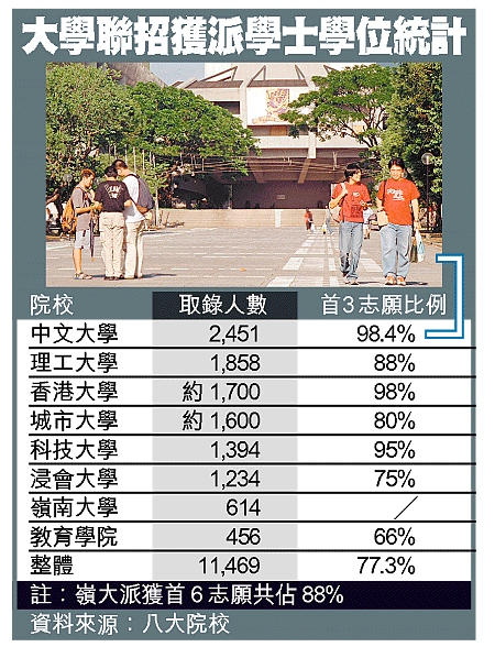 院校昨日提供的資料顯示,九成八獲派中文大學及香港大學學士學位的學生,都是獲派首三志願的課程,入讀科技大學的學生,也有九成五得以修讀首三志願課程。中大及港大各有約八十人透過中學校長推薦計劃獲得加分而得到取錄。