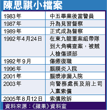 【本報訊】「無味神探」陳思祺督察於十三年前在大角嘴剿匪中槍,向警方索償一千七百萬元一案,昨日在高等法院判決,法官相信警方只是到涉案單位找偷車賊,沒預料賊人有AK47步槍及手榴彈等軍火,陳受傷是因違反上級指令,咎由自取,也不信陳若不受傷可升至警司或總督察高位,遂判他敗訴兼付訟費。 記者:梁偉強