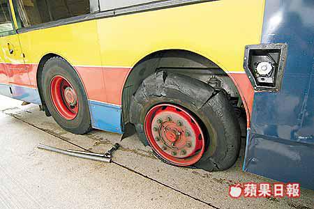 【本報訊】跑馬地發生罕見橡皮車胎爆裂甩脫意外,昨中午十二時許,一輛雙層城巴沿黃泥涌道行駛途中,右中軸車輪疑遭遺留地上鐵釘刺破橡皮車胎,導致俗稱「翻鑄胎」的翻新修補的橡皮車胎飛脫,擊中鄰線一輛私家車。私家車並無損毀,事後巴士公司與私家車司機協議和解,巴士公司工程人員到來更換車胎後,巴士繼續開行。
