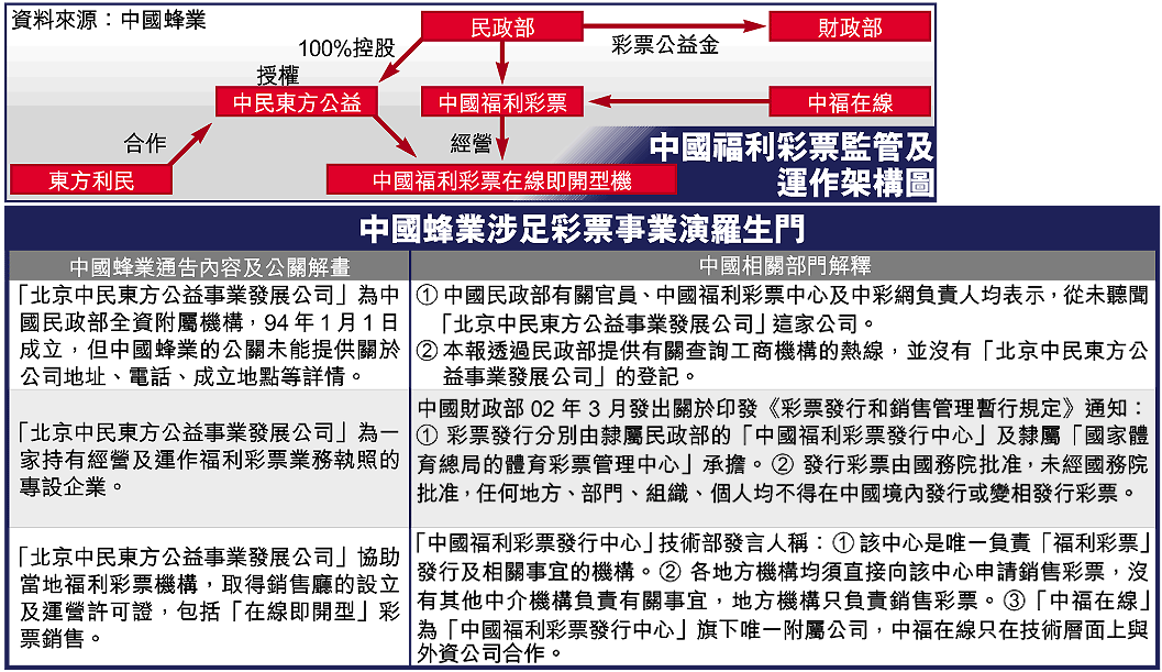 中國蜂業(8156)上周五股價急升1.02倍後,昨日即停牌,擬將配股集資。蜂業急升全拜進軍中國彩票業的「好消息」刺激,至於蜂業能踏足內地彩票業,聲稱是透過中國民政部旗下的「北京中民東方公益事業發展公司」(下稱北京中民東方)成為其合作夥伴。不過,對於北京中民東方的存在及營運則引起質疑。