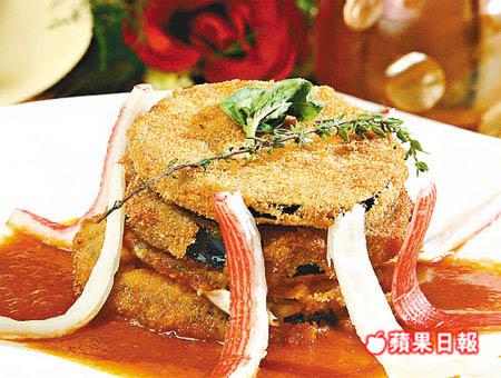 原為希臘千層沙律的茄子千層塔,三人一看便大讚賣相出色夠意頭,他們更提出加上蟹柳,令整碟菜更貼題。