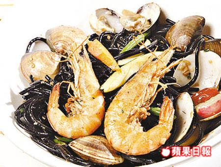 墨汁意粉8安士、蜆200克、蝦150克、青口200克、檸檬汁2茶匙、白酒3湯匙