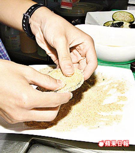 撲在茄子上的粉及麵包糠要夠薄,否則會變成厚厚的炸漿,不好吃。
