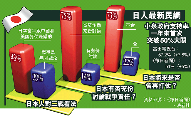 小泉昨天和日皇明仁伉儷一起在東京武道館出席六十周年儀式活動,在為戰爭死難者默哀一分鐘後,他向在場七千名戰爭死難者遺屬和官員發表聲明:「日本過去的殖民統治和侵略戰爭,給很多國家的人民造成極大傷害和痛苦,特別是我們的亞洲。日本謙卑地接受這個歷史事實,我在這裏再次表達我們深切的反省和由衷的道歉,並向在那次戰爭中的死難者表示深切的哀悼。」