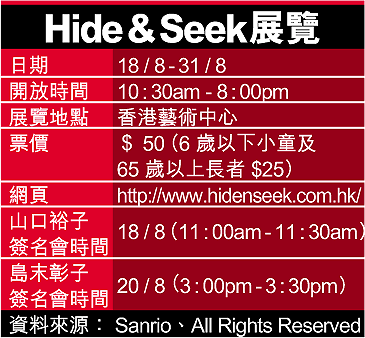Sanrio投資逾百萬元與AllRightsReserved合辦的「HideandSeek」展覽後天起至本月底於灣仔藝術中心舉行,在本港為HelloKitty三十周年Nakayoku(友共情)Project2005寫上句號。曾瑞群指出,本港是日本以外HelloKitty產品的最大市場,今年銷售額料有雙位數字增長。