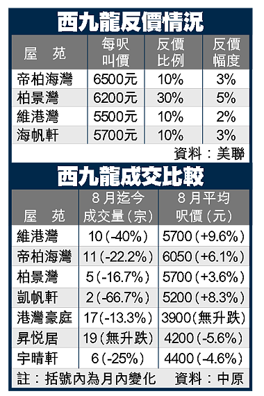 美聯物業董羅國安指出,政府昨日公布西九龍兩幅地皮勾出後,附近大角嘴柏景灣、帝柏海灣、維港灣及凱帆軒,有業主調高放盤叫價,當中以柏景灣反價幅度最大,佔30%業主反價5%,最新叫價6500元。