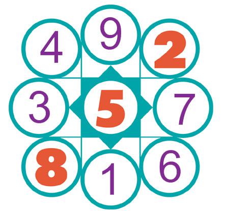 試在左圖的空格內填上適當的數字,使橫、直、斜相加同樣得出15。