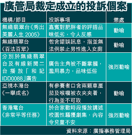 另外,廣管局審議六項投訴個案(見表),共涉六十二宗投訴,其中以校園性騷擾為主題的香港電台節目《非常平等任務》接獲二十四宗投訴,指內容令兒童不安,港台被強烈勸喻,港台教育電視部台長古啟輝表示尊重裁決。