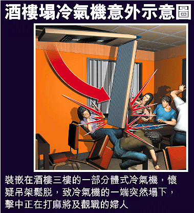 傍晚六時許,數名同事在上址竹戰,鄭婦則坐在兩名姓譚婦人的中間觀戰,突然一聲巨響,裝嵌在各人頭頂上的一部分體式冷氣機從天花板飛墮而下,首先擊中鄭婦的後腦,婦當場頭破血流。