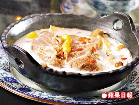 雍正御膳菜式之一,本應用羊奶,但受本地取材所限,以鮮奶取代羊奶,加入羊排、野菌、銀杏及杞子燉3-4小時,唔羶,似飲鹹味鮮奶。