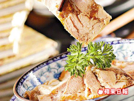 原隻豬肘以上湯及滷水汁烹煮,去骨拆肉連上湯雪凍成糕狀,上桌時切片;肉質鬆軟到一夾就散,啱夏天食的降溫頭盤。