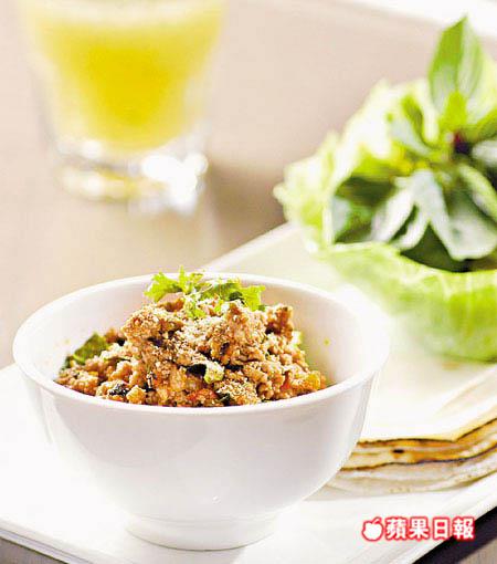 屬泰國北部的特色小食,香辣的免治豬肉,可配墨西哥薄餅或生菜片同吃,記得加一、兩片香草,辣中帶有陣陣獨特清香。