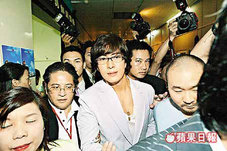 昨日早上十時多,身穿淺藍色西裝褸、內襯白色V領貼身上衣的俊哥從飯店大廳步出,影迷即一擁而上。見慣影迷瘋狂行為的俊哥仍然處變不驚,更故意放慢腳步,讓身邊的影迷及傳媒拍照。