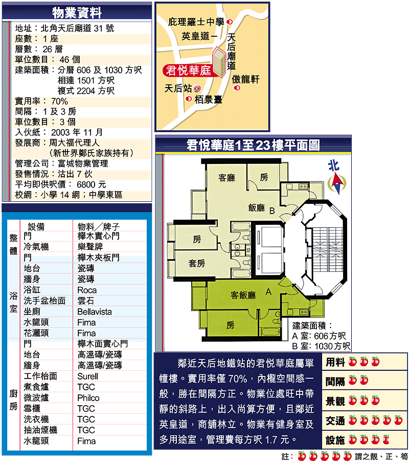 港島北角至天后一帶,新盤多為單幢樓,大型屋苑較少。周大福鄭氏家族年初買入天后廟道31號全幢,現改名君悅華庭出售,為該區單幢式新盤。物業鄰近地鐵站及維多利亞公園,社區配套方便就腳。