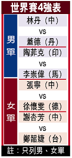 王晨雖痛失獎牌,不過,明年開始,原定兩年一次的世界賽將改為每年舉行,三十歲的王晨仍有機會為香港爭光。而今屆世界賽餘下的男、女單四強,有三名中國球手,包括男單世界第一的林丹、女單世界第一及第二的張寧、謝杏芳(見附表)。