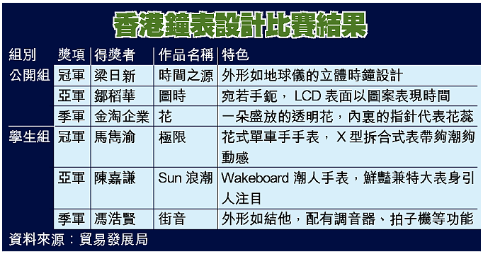 【本報訊】港人創意無限,花一點心思加上一點幻想,令一個可自轉公轉地球儀、一朵剔透塑膠花,竟化作計時的鐘表,一舉奪取新一屆香港鐘表設計比賽大獎,並於下月在灣仔會議展覽中心的○五年香港鐘表展展出,與其他國家的品牌鐘表爭一日之長短。