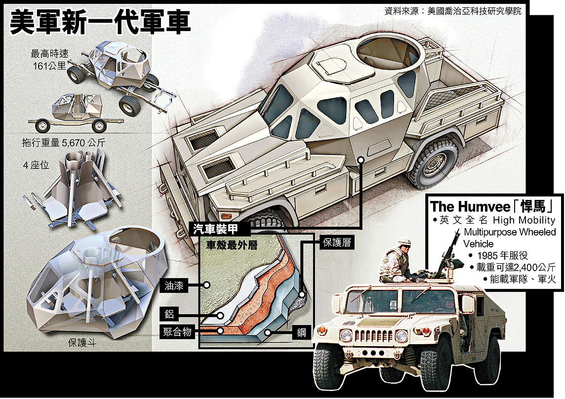 Humvee「悍馬」是美軍主力軍車,從阿富汗戰爭到伊拉克戰爭,「悍馬」都必定登場。「悍馬」之名夠威猛,銅皮也具防彈能力,但打起城市戰、遇路邊炸彈和自殺式炸彈,裝甲卻嫌不夠強悍,令美軍傷亡慘重,因此美軍計劃加快新一代軍車的研究。