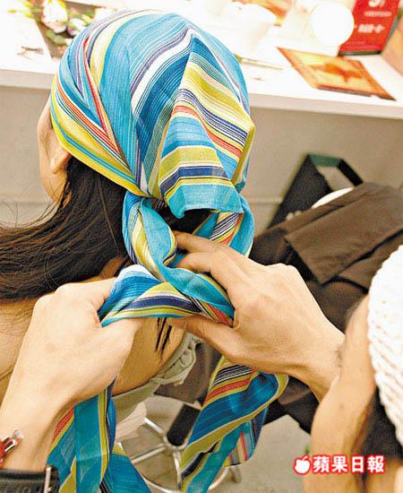 如果嫌鮮花誇張,簡簡單單一條絲巾都可以幫你一改沉悶外形。髮型師Gazz話今年流行用絲質及多pattern的頭巾,而且包絲巾的時候最緊要係個feel,沒有一定的規則,隨意包出啱心水的效果便可,最重要的反是選擇跟衣服合襯的絲巾。