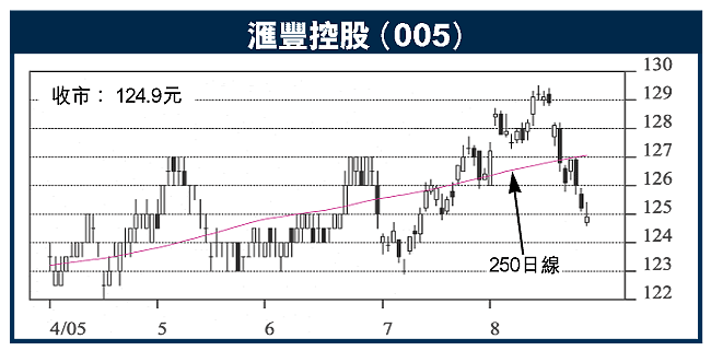 走勢上,在調整早前大約1.09元的股息因素,近期滙控再度失守250日平均線,對後市有點不太理想,此因素稍後再詳談。短期滙控較強的支持大約在123-124元區,此水平不宜失守。