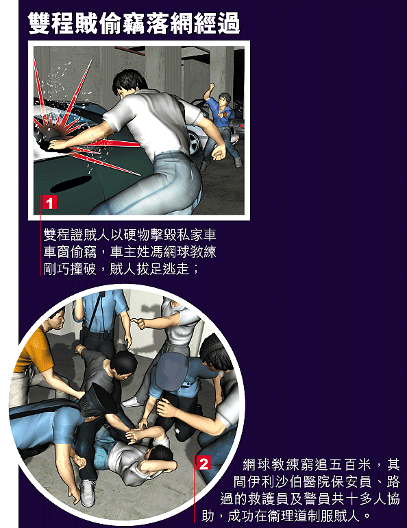 【本報訊】何文田衞理徑南華會網球中心停車場昨上演捉賊記。一名網球教練把手機及銀包留在車內,引來雙程證賊人垂涎,涉嫌以硬物擊毀車窗偷竊,其間網球教練返回取物撞破。他與賊人追逐五百米,稍後在伊利沙伯醫院保安員、救護員及警員協助,合十多人之力制服及拘捕賊人。 記者:張家樂