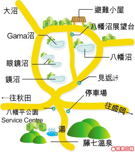 花令人動心,但八幡平山頂登山徑卻讓我見識了在標高1,613米高山上的大大小小湖泊。從起點見返山卡開始,往終點八幡沼的兩小時內,花仍在笑臉迎人,但途上看到鏡沼、眼鏡湖等由火山爆發而成的小湖泊,就是天氣不佳,但湖色是自然的深藍和翠綠,好吸引!坐在湖畔,遠遠的是一個接一個的山峯,深深吸一口氣,心情立即豁然開朗。再走,最大的八幡沼就在腳下,綠的山藍的水,我明白為甚麼每逢假日,日本人就扶老攜幼來行山,如此誘人的山色湖光,真是捨不得落山……