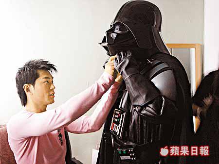 原來古仔早前出席康城影展時,特別從法國訂購這套黑武士服裝,故當他收到這件新玩意後,感到莫名興奮。古仔還細心地為髮型師戴上各配件,最有趣的是原本以六呎高身材裁製出來的黑武士服裝,穿在髮型師身上後,竟變成縮水版黑武士,古仔更頑皮地請髮型師一邊幫他吹頭,一邊用黑武士面具內可以傳聲的咪與他談話。廣告商還是第一次看見平時Cool爆的古仔,拿到心愛玩具後,變成大孩子般跳蹦蹦,為嚴肅的拍攝現場帶來了歡樂和笑聲。