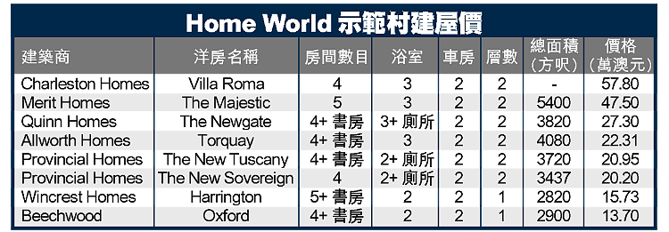 筆者所到HomeWorld示範村,每星期都有逾萬人參觀,村內有近30間建築公司逾百間示範屋,其中包括不同風格特色的建築,如Tuscany、Georgian、Victoriana、Colonial、FrenchProvincial等,建屋價介乎11.7萬至60萬澳元之間。這個示範村已是第四期,早幾期示範村已全部售出,變成住宅區,預計三、四年後,又有第五期落成。