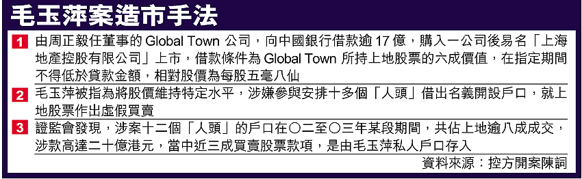 上海地產總經理毛玉萍等人,涉造市及妨礙司法公正案昨日正式開審。毛涉指示為她處理股票買賣的助理雷靜儀,操控十二個戶口買賣上地股票托市,以避免違反向中銀借貸逾十七億元的條款。毛玉萍被捕後稱,按丈夫周正毅及上地前董事李燈場指示找「人頭」穩定股價,毛更被指曾向雷暗示,把責任推到周正毅身上。 記者:黃詠鍶