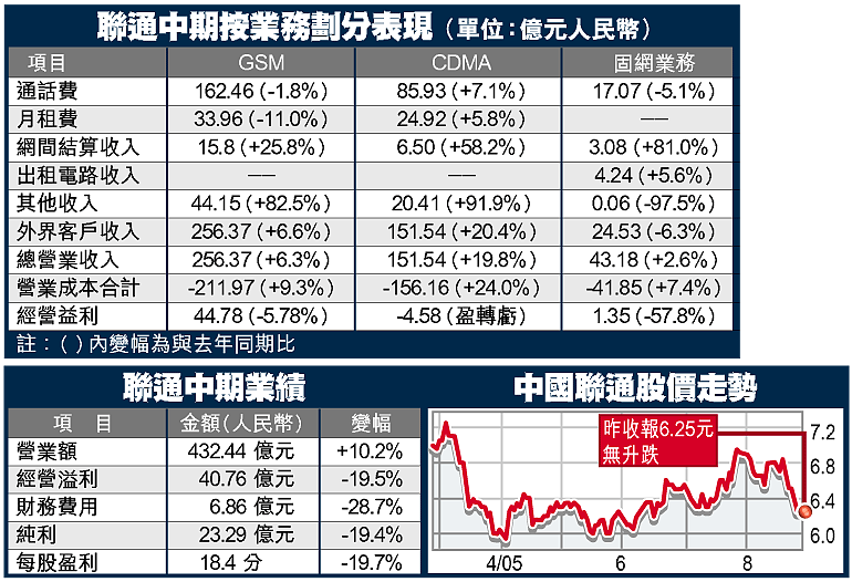 中國聯通(762)受CDMA業務虧損,及GSM和固網業務收益下跌拖累,截至6月底中期純利倒退19.4%,至23.29億元(人民幣.下同)。營業額較去年同期升10.2%,至432.44億元。每股盈利0.184元,不派息。聯通董事長兼首席執行官常小兵表示,下半年繼續推進發展模式轉型,注重控制CDMA營銷成本及改善CDMA經營效益,料全年情況仍屬樂觀。