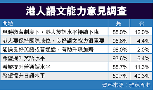 雅虎香港最近進行一項香港人的競爭力與語言水平網上問卷調查,訪問近五百人,八成八受訪者認為受母語教學影響,香港人的英語水平每況愈下;九成半人認為香港要保持國際地位及經濟發展,必須有良好語言能力;九成八人更認為英語或普通話能力好,會直接影響升職加薪的機會。