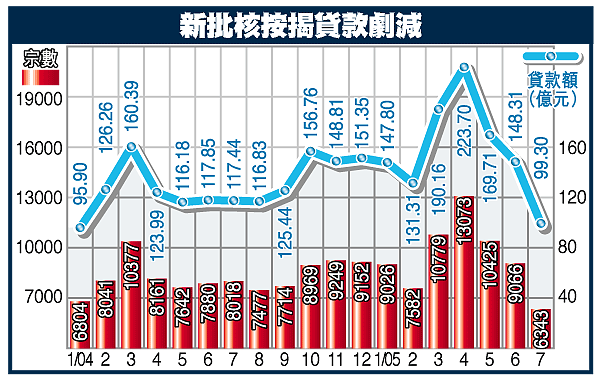 【本報訊】樓市交投受加息影響而放緩,加上7月份未有大型一手樓盤推出,令認可機構期內新批核的樓按貸款較6月減少33%,至99.3億元。金管局公布的7月份按揭調查顯示,新批按揭貸款除連續跌3個月外,也是自04年1月以來首次跌穿100億元水平。對上一次的跌幅超過三成紀錄,要追溯至03年8月,當時新批核貸款減少32.3%。