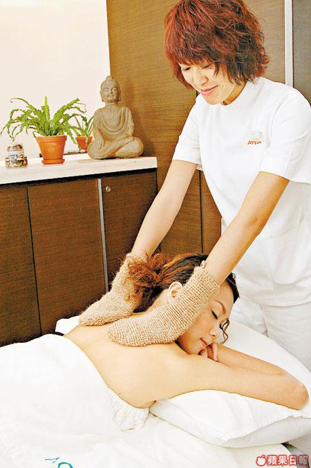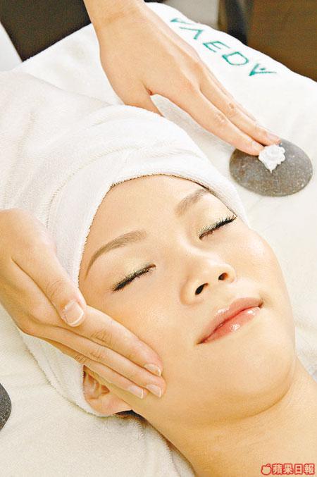 面部經過磨砂和面膜滋潤後,美容師按客人的自然元素,用石頭來溫暖雙手(不同石頭熱度配合不同元素),替客人按摩面部不同穴位,促進血液循環,減淡肌膚色素和黑斑。