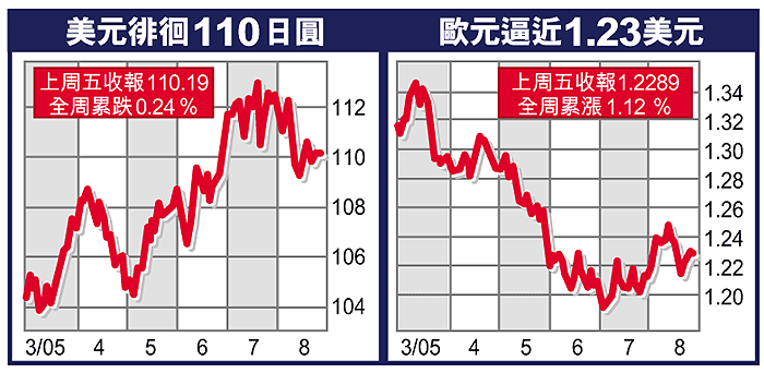歐元前日微跌0.13美仙,收報1.2289美元,結束一連4日的升市。同日關於中國會在短期內重估人民幣值的傳聞,曾拖累美元滑落至109.37日圓,但最終收高於110.19日圓,倒升0.15日圓。全周計算,歐元上星期仍累計升了1.36美仙(1.12%),美元跌去0.27日圓(0.24%)。