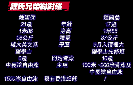 近十年來,香港泳壇出現不少兄弟姊妹班。早期的有郭健明/郭漢明、黃海滴/黃海湲、近期的有蔡曉慧/蔡振宇姊弟及鍾氏兄弟。論兩人加起來的成績,曾雙雙出席○○年悉尼奧運的郭家兄弟最為突出;但國樑及國鼎也不遜色,除在今個月內,兩人分別代表香港參加世大運及全國中學生運動會外,更會在十月雙雙出戰南京全運及澳門東亞運。