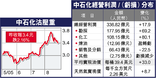 中石化受惠於油價高企及化工業務增長強勁,中期純利達196.53億元人民幣(下同),增長17.4%,優於市場預期。由於內地成品油價受到限制,中石化煉油業務經營虧損近13億元,煉油毛利大減43%至每桶2.32美元。