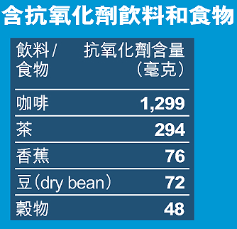 美國人飲咖啡飲上癮,農業部數字顯示,每名美國人平均每天飲一點六四杯咖啡,即平均攝取逾一千二百毫克抗氧化劑,比茶多出四倍。負責研究的文森教授說︰「美國人從咖啡攝取的抗氧化劑,比任何食物也要多,沒有一個能接近它。」
