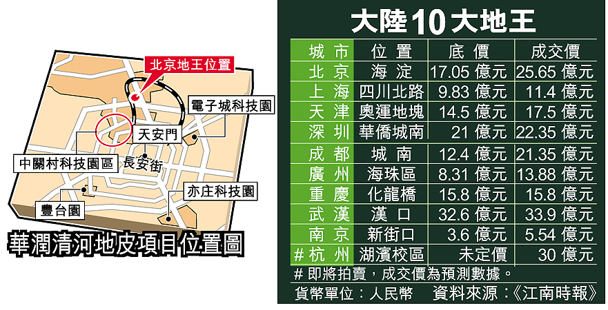 為提高土地使用的透明度和杜絕腐敗現象,中央對全國各地的商業用地嚴格執行土地拍賣政策。在公開競投下,全國各地的地王相繼出現。據統計,本月初北京一幅以二十五億六千五百萬元人民幣(下同)成交的海淀區地王,被評為全國十大地王之首。業界對在當前宏調政策下,該地皮仍錄得天價的紀錄,感到驚訝。