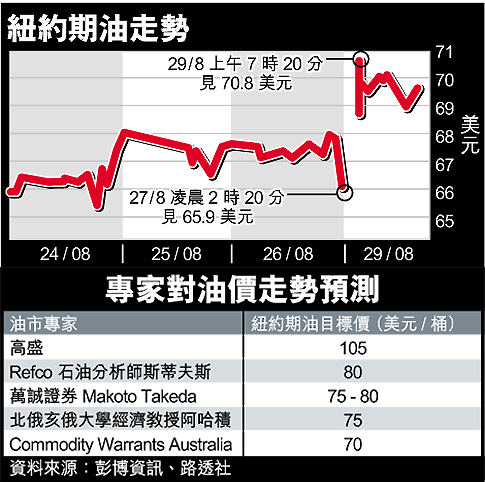 紐約原油十月期貨在場外交易時段曾攀上每桶七十點八○美元的新高峯,勁升四點六七美元,相當於百分之七點○六,是二十九個月來最強勁的單日升幅。以昨天高位計算,紐約期油自年初迄今已累計飆升百分之六十三。