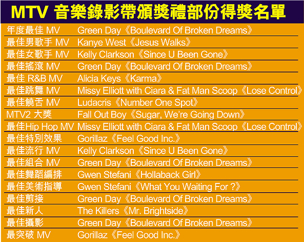 賽前獲八項提名的人氣組合GreenDay勇奪七項大獎,他們以《BoulevardOfBrokenDreams》奪最高殊榮年度最佳MV、最佳搖滾MV、最佳組合MV、最佳導演、最佳剪接及最佳攝影獎,而另一作品《AmericanIdiot》亦獲觀眾票選大獎。組合主音BillieJoeArmstrong興奮地說:「我們很高興發現搖滾音樂在MTV仍有一席位。」組成十六年的GreenDay領取最後一個獎項時,也毋忘身在海外的美軍,希望他們平安回家。