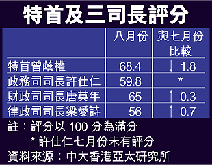 三司方面,財政司司長唐英年及律政司司長梁愛詩的評分都輕微上升,新任政務司司長許仕仁首次評分為五十九點八,但由於半數受訪者稱不認識許,顯示許要加強工作,增加市民對他的認識。